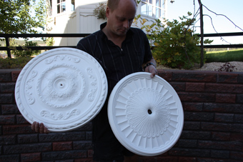 D05 ruusuke - halkaisijan mitta 750 mm - sileä osa toimii kehyksenä ja - keskiosa toimii varsinaisena koristeosana Huom. Asiakkaan kuva oikealla: "Ruusuke korostaa ja antaa taustan valaisimelle, joka pelkistetyssä katossa ei ehkä pääsisi oikeuksiinsa..." "Kun miettii valaisimen ilman ruusuketta, jotakin tärkeää jää kaipaamaan?" Asiakkaan valaisin. |